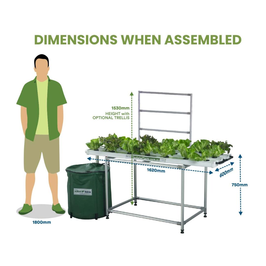 Thinking of starting your own vegetable and herb garden but not sure where to start? The Medium Hydroponic Salad Table is the all in one solution and includes everything you need to start growing your own garden. Reduce water consumption by up to 90% when compared to a standard soil garden and outstanding productivity in an area of less than 1.5 square metres. Designed with hole spacings that allow for larger varieties of veggies such as lettuce, cabbage, kale, silverbeet and choy. It's also perfect for smaller bunched herb varieties such as coriander, basil, chives & the list goes on and on. Add our optional Trellis and you'll also be growing vine crops such as tomatoes, cucumber, beans and peas.